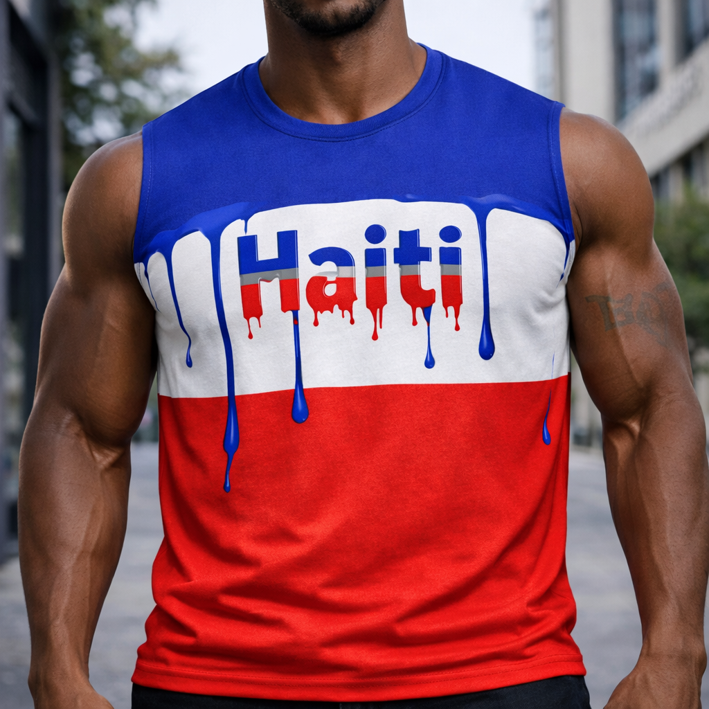 Ce débardeur présente un design tricolore aux couleurs du drapeau haïtien - bleu royal en haut, blanc au centre, et rouge éclatant en bas. Au centre, l'inscription "Haiti" avec un effet de peinture dégoulinante spectaculaire : les lettres "Ha" en bleu et "iti" en rouge semblent couler comme de la peinture fraîche, créant un effet visuel dynamique et moderne. Des gouttes de peinture bleue et rouge ajoutent à l'esthétique street art.