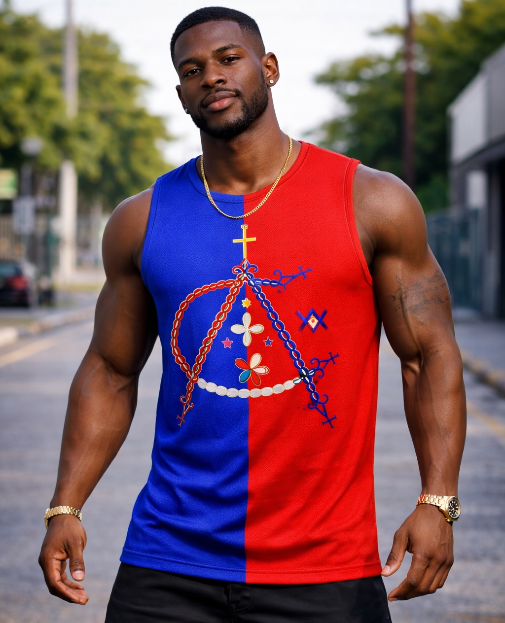 Ce débardeur présente un design split bicolore spectaculaire - bleu royal à gauche et rouge éclatant à droite, représentant les couleurs du drapeau haïtien. Au centre, un magnifique vèvè (symbole sacré vaudou) en forme de cœur orné de chaînes dorées et bleues, avec une croix jaune au sommet et des symboles mystiques dispersés sur tout le design.