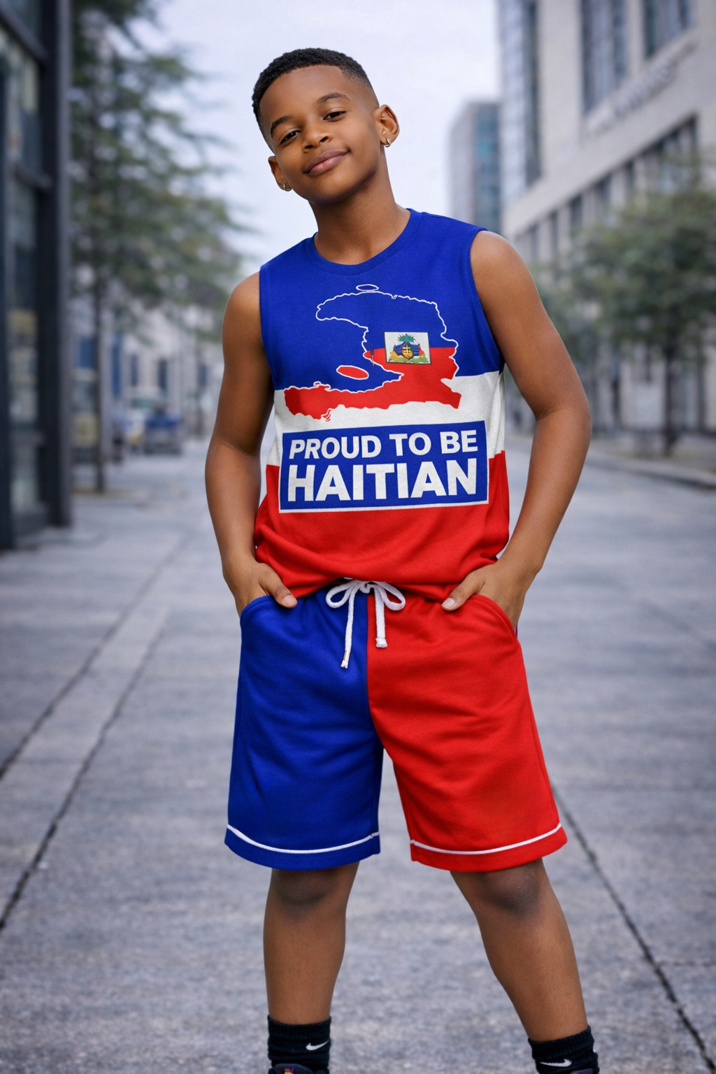 Ensemble sportif deux pièces aux couleurs du drapeau haïtien, parfait pour les jeunes fiers de leur héritage. Comprend un débardeur confortable avec le design "PROUD TO BE HAITIAN" et un short assorti aux couleurs bleu et rouge emblématiques.