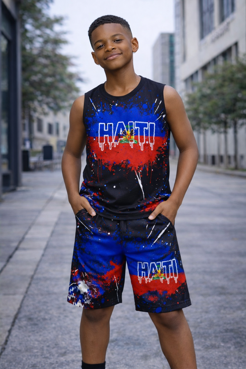 Ensemble sportif deux pièces avec débardeur "HAITI" et short assorti sur fond noir avec effet galaxie spectaculaire aux couleurs du drapeau haïtien. Un design urbain moderne avec les armoiries nationales et effet peinture éclaboussée pour un style unique.