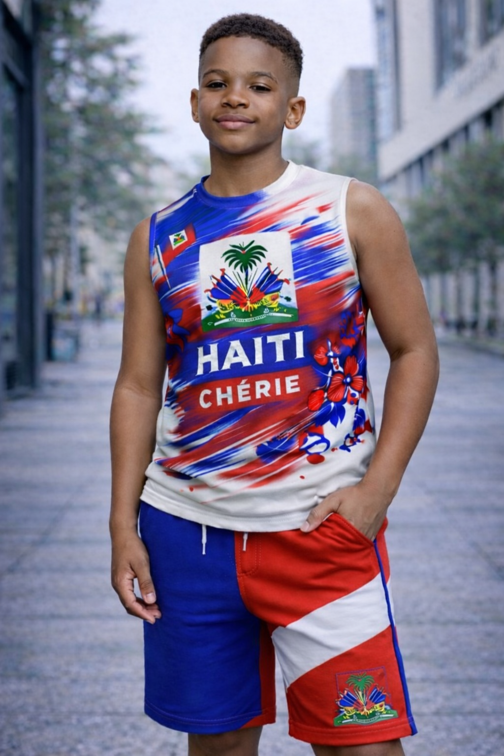 Ensemble sportif deux pièces avec débardeur "HAITI CHÉRIE" et short assorti aux couleurs du drapeau haïtien. Un design spectaculaire avec les armoiries nationales d'Haïti et effet peinture artistique pour célébrer l'amour du pays.