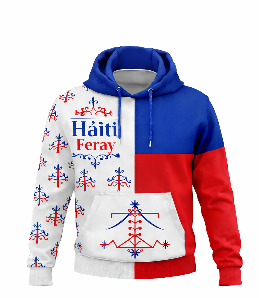 Célébrez la culture haïtienne avec ce magnifique chandail à capuchon Haïti Feray. Conçu avec fierté, ce vêtement unique présente des motifs traditionnels haïtiens dans les couleurs emblématiques du drapeau : bleu et rouge.